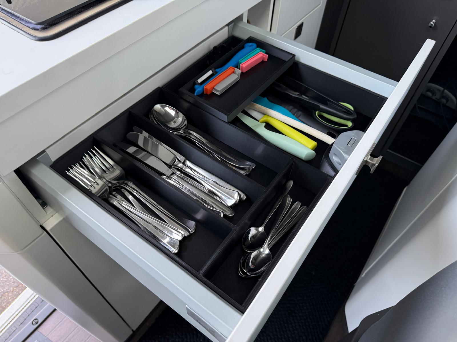 Bisher haben wir in unserem Cali einen Besteckeinsatz von IKEA genutzt. Der hat zwar ganz okay gepasst, ist aber immer etwas hin und her gerutscht.