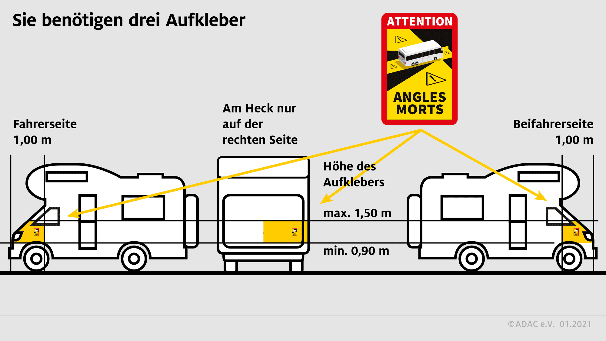 The warning signs (prescribed height 25 centimeters, width 17 centimeters) must be attached to both sides of the vehicle and on the Tail be attached. Care must be taken to ensure that the vehicle’s license plates and prescribed lettering remain visible. The lighting equipment and the driver’s view must also not be obscured. On glass surfaces such as side or rear windows, the blind spot notices are taboo.If technically possible, the stickers or signs must be attached to the vehicle rear to the right of the longitudinal centerline at a height of between 0.9 and 1.5 meters from the ground. side marking is to be placed on the left and right within the first meter measured from the front of the vehicle at a height between 0.9 and 1.5 meters from the ground. If this is demonstrably impossible for technical reasons, the marking must be as close as possible to the regulations, up to a maximum height of 2.1 meters from the ground.Motorhome drivers are advised to use a Stickers with bus symbol to be used because the motor homes are vehicles for the carriage of passengers and not for the carriage of goods. Even though some online retailers now offer an additional version of the French blind spot marking with camper symbol offer, their use is not recommended. These stickers do not meet the legal requirements, there is no official version with camper symbol.