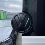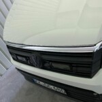 Siinä se on edessänne, Grand California, kaikki sopii yhteen, olette valinneet valkoisen värin. Ulkovärin ja mustan folion välinen kontrasti sopii täydellisesti yhteen, ja sitten on vielä musta markiisi, ihanaa. Melkein… jos ei olisi noita hopeisia Volkswagenin logoja ja tuota krominauhaa jäähdyttimen säleikössä.