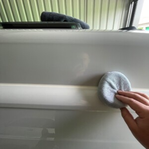 Saimme myös tietää Meguiar’sin keraamisesta tiivisteestä suosituksen kautta. Hybrid Ceramic Liquid Car Wax -tiivistysaine on siitä erikoinen, että se on erittäin helppo levittää eikä sitä tarvitse jättää tuntikausiksi. Ajoneuvon pesun jälkeen tiiviste levitetään levitystyynyllä ja pyyhitään pois mikrokuituliinalla 5 minuutin vaikutusajan jälkeen. Siinä kaikki.
